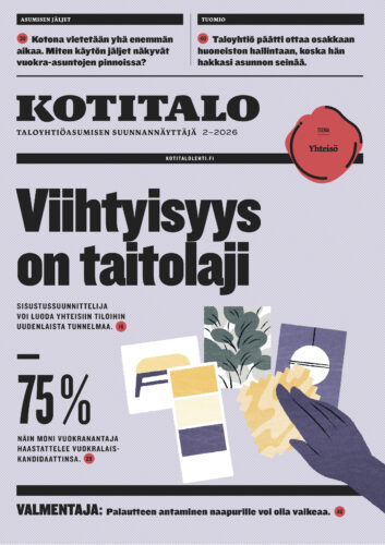 Kotitalon 2/26 teemana on yhteisö. Kerromme vantaalaisesta vuokratalosta, jonka sisustuksessa näkyy vahvasti ammattilaisen kädenjälki. Oikeilla ratkaisulla voidaan lisätä viihtyvyyttä ja yhteisöllisyyttä taloyhtiössä. Kirjoitamme myös siitä, millaiset asumisen jäljet luokitellaan normaaleiksi sekä annamme parhaat siitepölyajan vinkit allergisille.