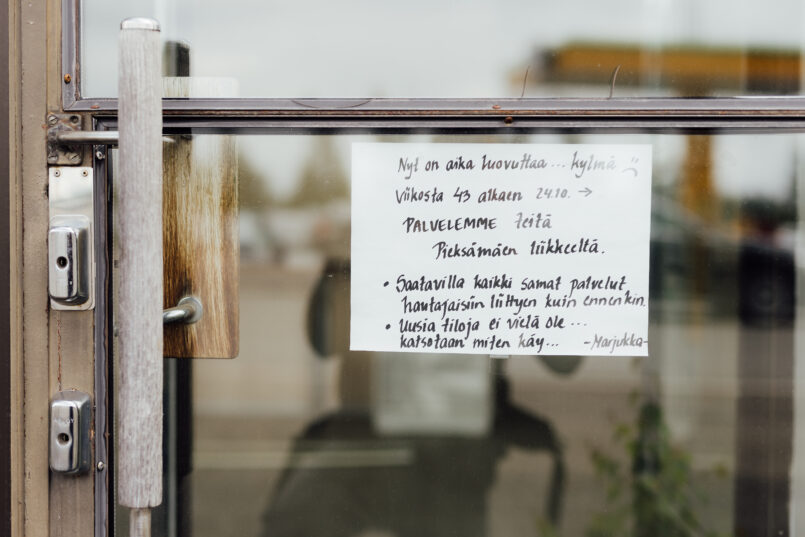Kivijalkaan jääneet yritysten kyltit ja ikkunatarrat muistuttavat tyhjillään seisovan talon menneisyydestä Haukivuoren kylänraitilla Etelä-Savossa. Haukivuori liitettiin Mikkeliin 2007.