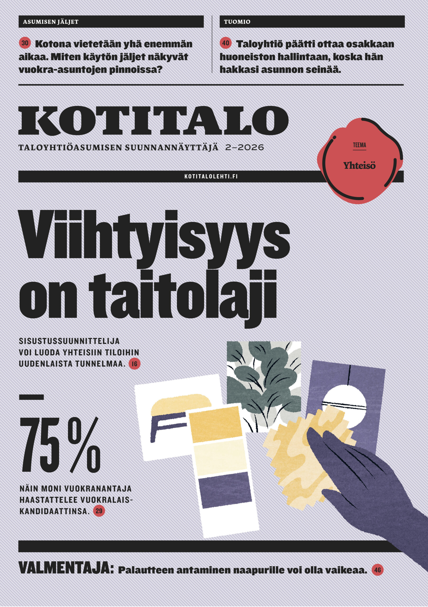 Lue vastausKotitalon 2/26 teemana on yhteisö. Kerromme vantaalaisesta vuokratalosta, jonka sisustuksessa näkyy vahvasti ammattilaisen kädenjälki. Oikeilla ratkaisulla voidaan lisätä viihtyvyyttä ja yhteisöllisyyttä taloyhtiössä. Kirjoitamme myös siitä, millaiset asumisen jäljet luokitellaan normaaleiksi sekä annamme parhaat siitepölyajan vinkit allergisille.
